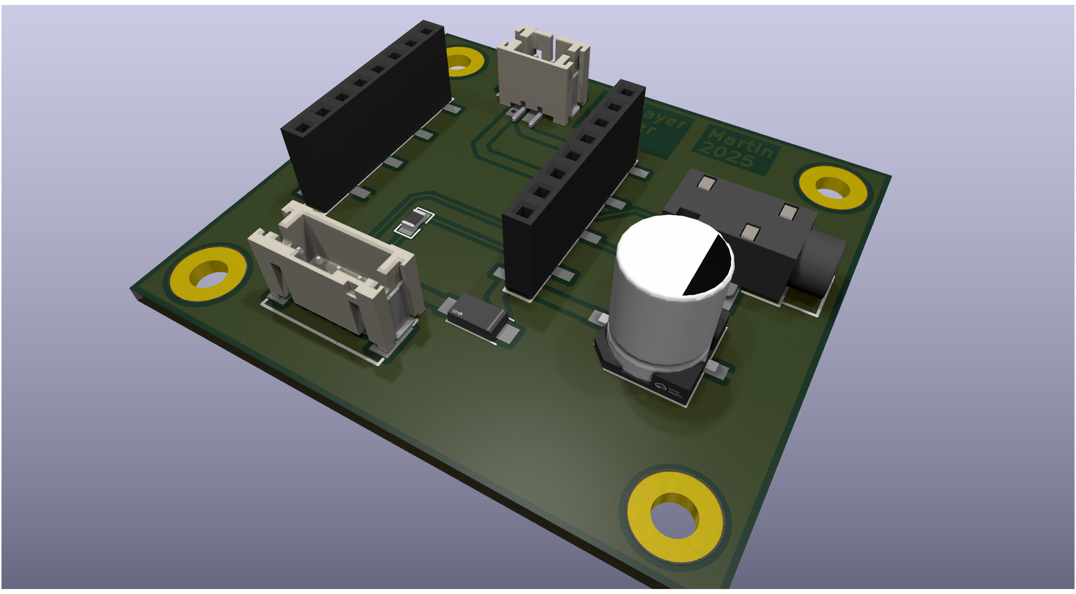 • Power Supply: On-board diode is used to drop the input voltage to a DFPlayer-safe ~4.3V. An electrolytic capacitor is included for power supply filtering, ensuring smooth operation.